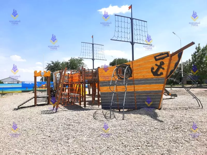 На берегу моря, почти у самой кромки воды, стоит прекрасный игровой комплекс «Фрегат Император». Яркий, стильный принт, который украшает борта корабля, обязательно привлечет внимание детей и взрослых. Огромный корабль, достигающий 11,5 метров в длину, очень практичен в своём использовании, ведь каких только игровых элементов в него не заложено: винтовые и простые горки, туннели-переходы, стенки для скалолазания, качающиеся мостики, лазы и многое другое!