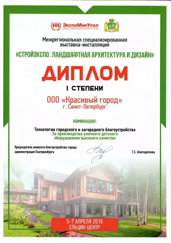 По итогам выставки мы получили Диплом I степени, за производство уличного детского оборудования высшего качества.