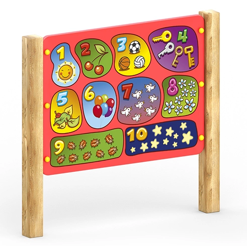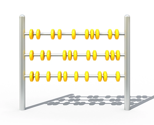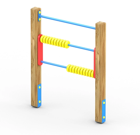 Игровой элемент счёты. Помогают ребёнку развивать вычислительные навыки, а также моторику. Обычно такой развивающий элемент встраивается в детскую площадку или игровой комплекс на деревянные столбы, также может служить и отдельной стойкой со счетами. Можно помочь ребёнку, объяснив, как работают счёты и почему на них так просто и удобно считать, ребёнок втянется и будет изучать математический счёт, посредством игры.